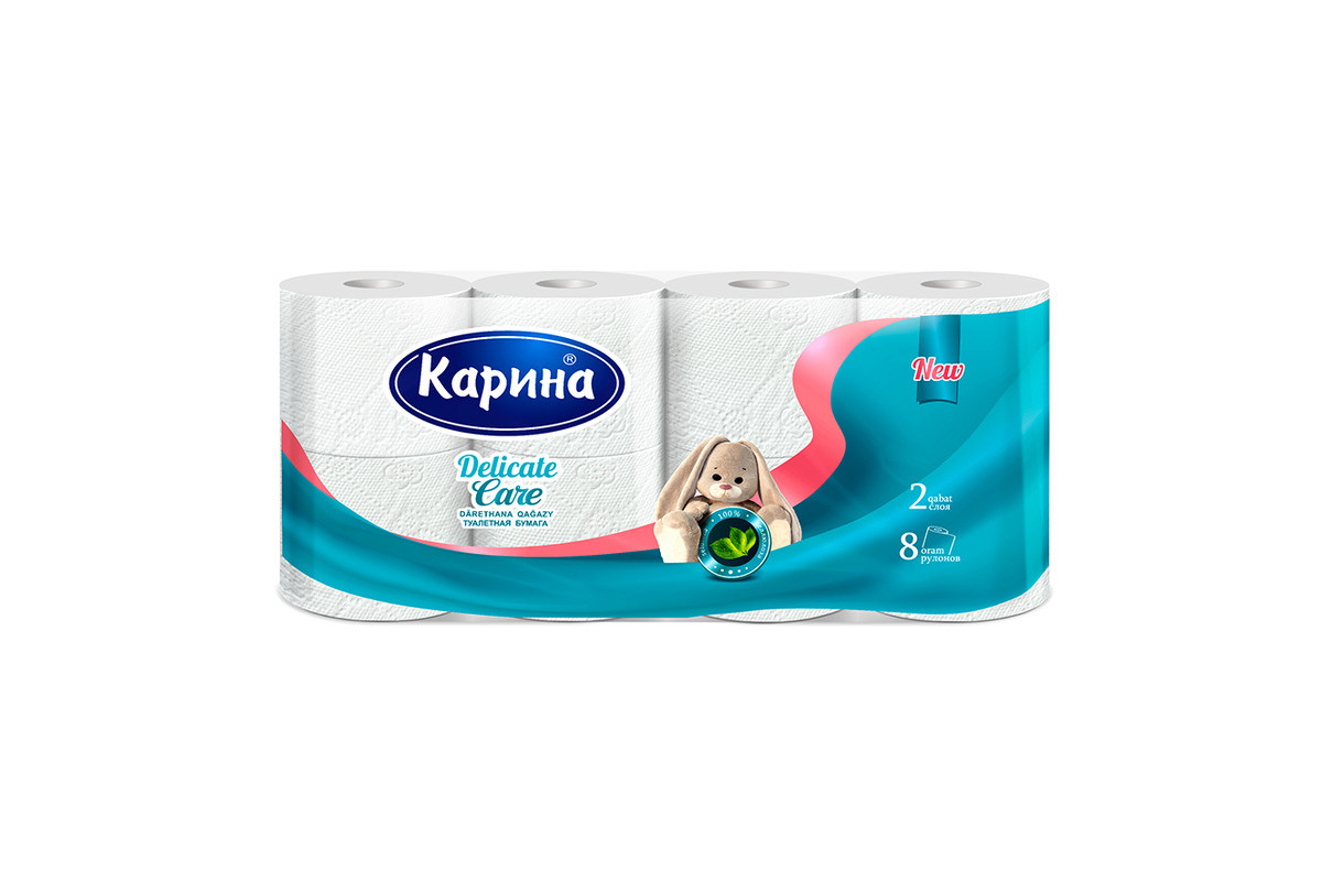 Главная / Хозяйственные товары / Туалетная бумага Карина «Delicate Care» 2-х слойная (12шт/упак)